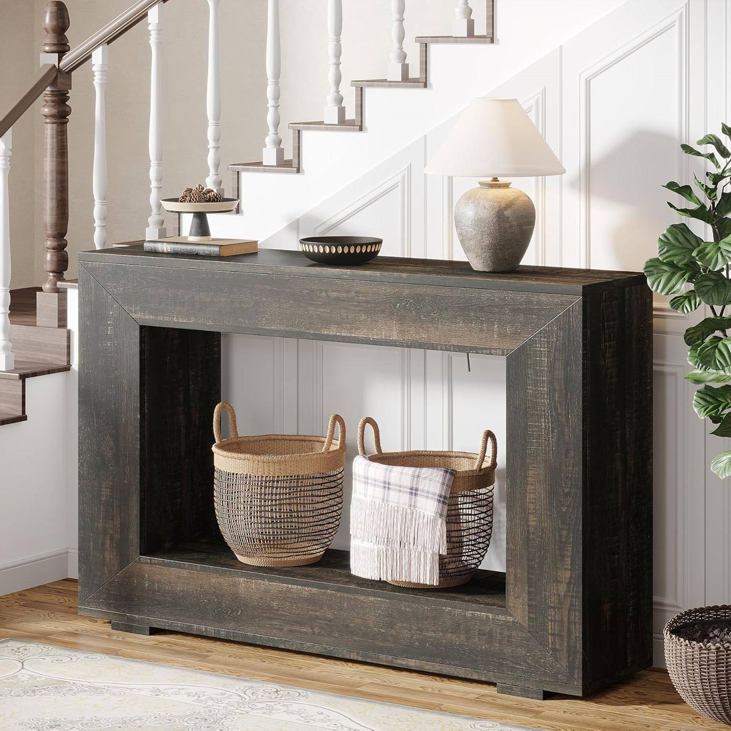 Inspired by a farmhouse design, this Modern Farmhouse 47-inch Long Sofa Table in Dark Grey Black Wood Finish exudes a vintage simplicity that adds a welcoming rustic charm to your home. As flexible as your imagination, this console table with storage can function as a sofa table, an entryway table in the foyer, or even as a decorative accent table in any room. Measuring 47.2"L x 11.8"D x 32.8"H, this entryway console table offers ample space for storing and displaying items, keeping your home organized and clutter-free. Skillfully constructed from high-quality particle board, this hallway table provides longevity and stability. Its robust construction makes this table perfect for showcasing decorative pieces. Assembly is simplified with labeled parts, detailed instructions, and included hardware. Additionally, we offer a 1-year quality assurance and lifetime customer service guarantee.