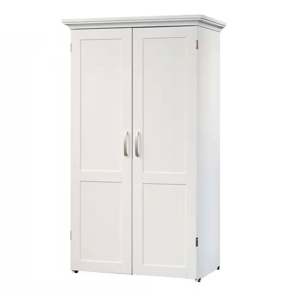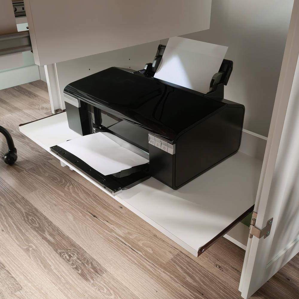 If collecting craft supplies has become as much of a hobby as crafting itself, this Drop Leaf Computer Desk Craft Table Armoire in White Wood Finish - Made in USA should be your next investment. This computer armoire easily conceals an extra workspace until you’re ready, with a drop leaf work table that fully extends, revealing an entire work surface. It’s the perfect spot for drawing, painting, working from a laptop, or placing a sewing machine. The center shelf of this armoire with fold-out desk also features a power strip with six outlets for convenient electrical access without the chaos of cord clutter. Six adjustable shelves provide convenient and flexible space for storage of files, folders, stencils or reams of paper. The lower slide-out shelf of this craft armoire offers retractable storage space for a printer or a cricut machine, providing easy access or a hiding space. Finished in White Wood Finish, this space-saving cabinet can function as a craft or sewing armoire, an office armoire, or all three!