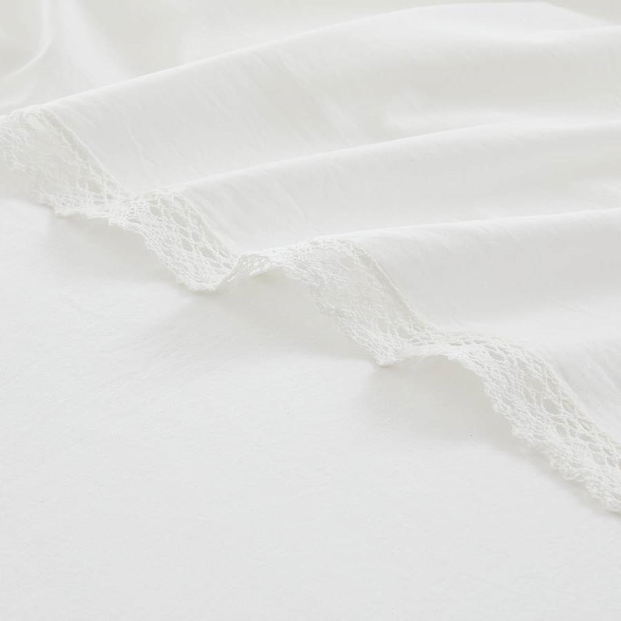 A little lace goes a long way! These white bed sheets bring effortless style to your bedroom decor. Their simple design makes them versatile for any decor theme, while the delicate lace trim adds a touch of charm. Perfect for farmhouse or coquette style homes, this cozy sheet set combines a solid color base with a beautiful accent. Made with 100% cotton for a lightweight, breathable feel. This 4 piece set includes 1 flat sheet, 1 fitted sheet, and 2 pillowcases. Machine washable for easy care.
