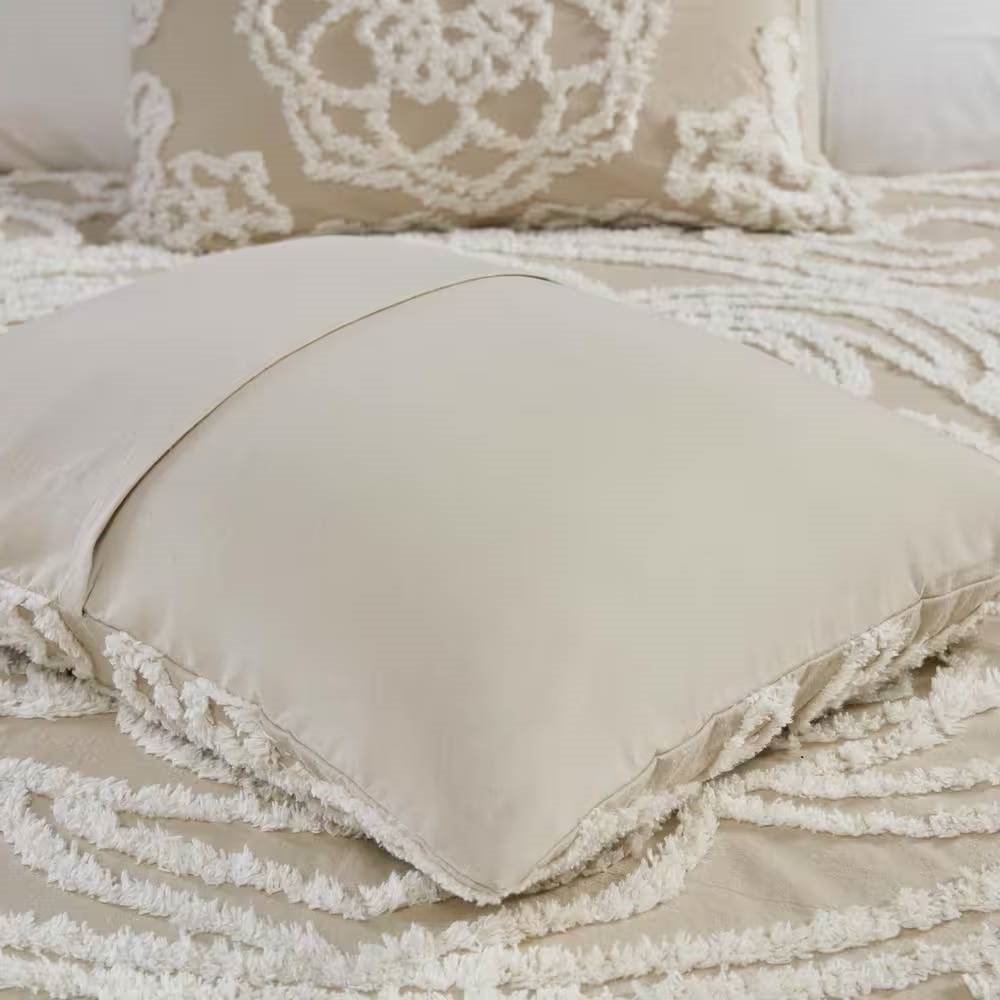 This Queen 100-Percent Cotton Chenille Bedspread with Fringe Hem in Khaki Taupe Beige provides an alluring shabby chic update to your bedroom. This globally inspired coverlet features a 100% cotton face and reverse with a tufted chenille medallion centered on top of the bed. A decorative fringe hem adds dimension, while 2 matching shams (1 in. twin/twin XL) complete the boho look. Perfect for all seasons use, this bedding set is also OEKO-TEX certified, meaning it does not contain any harmful substances or chemicals to ensure quality comfort and wellness. Due to the nature of the chenille fabric, some shedding will occur naturally in the first 3-4 washes.