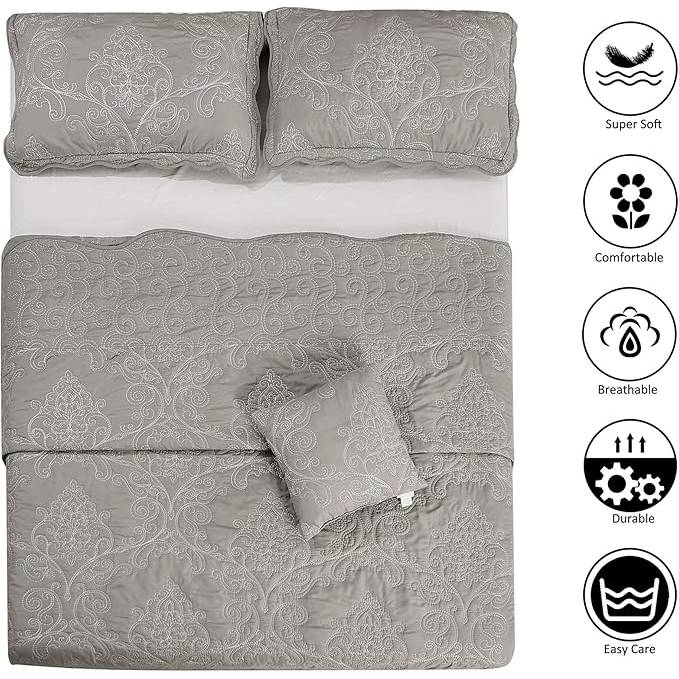 The King size Ash Grey Damask Embroidered 4 Piece Oversized Bedspread Set is elegant and classic but these are made of high-quality polyester that is ultra-soft and durable. The fabric is intensely cozy and will last a lifetime with proper care and every wash will get softer and softer over time. This pattern quilted embroidered quilt is a unique quilt that can be used to sleep under as well as makes any bed look like a fantastic centerpiece.